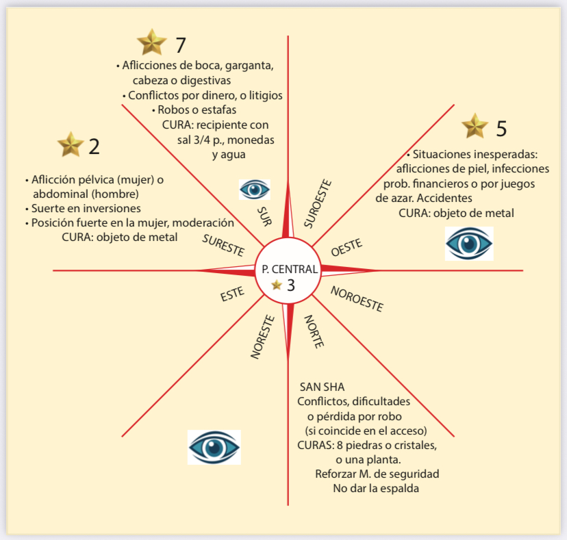 De manera preventiva, ubique las curas mensuales sugeridas, o evite activar los ambientes de su casa, o lugar de trabajo, donde esté coincidiendo alguna de estas estrellas (energías). El PALACIO CENTRAL estará recibiendo la visita de la estrella 3, conocida como la estrella hostil, la cual ocasiona conflictos o pleitos legales. Esta energía tiende a afectar a las mujeres mayores, en particular. En caso de que en este palacio coincida un ambiente importante como, por ejemplo, una sala de juntas, un comedor o una alcoba, ubique una vela o un objeto rojo brillante.